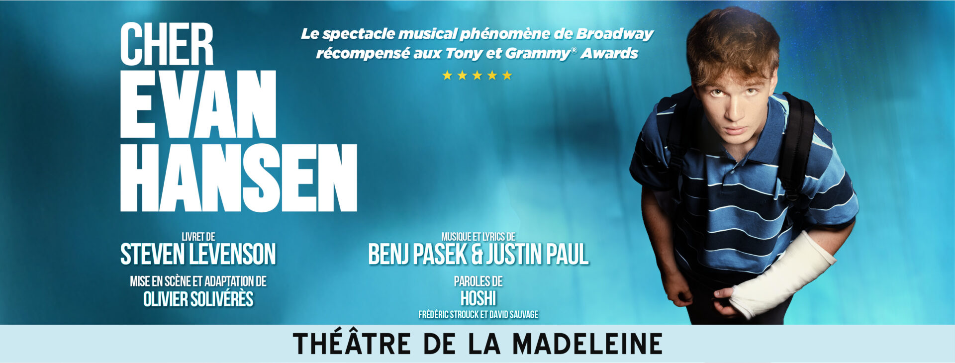 Porté par des chansons poignantes écrites par les auteurs-compositeurs et producteurs Benj Pasek et Justin Paul, notamment connus pour leur travail récompensé aux Oscars, aux Grammy Awards et aux Tony Awards sur La La Land et The Greatest Showman, le spectacle bénéficie d’une adaptation française des paroles signée notamment par Hoshi. Les interprètes seront accompagnés sur scène par un orchestre live.